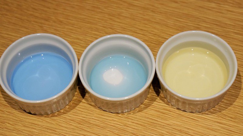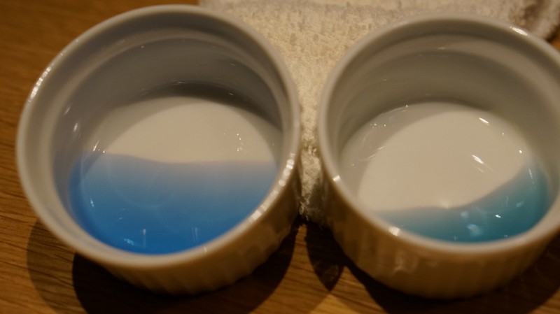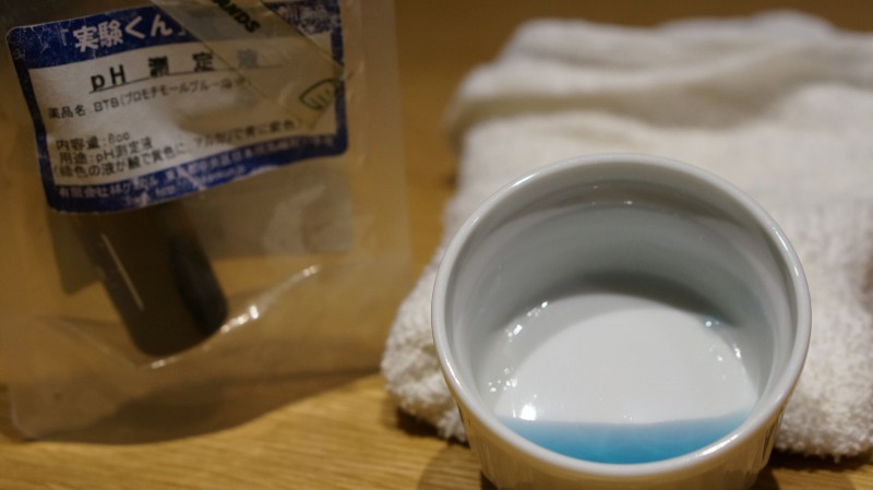 PH値がわかる薬品で当館のお水に混ぜてみると、すごくきれいな濃いブルーの色をしております。