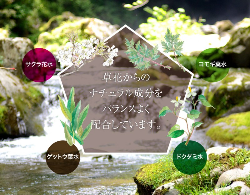 水・温泉水・サクラ花水・ドクダミ水・ヨモギ葉水・ゲットウ葉水・BG・グリセリン・乳酸桿菌/ダイコン根発酵エキス・コメ発酵液・ユズ種子エキス・褐藻エキス・PPG-10メチルグルコース・ポリソルベート20・カプリル酸グリセリル・コメ胚芽油・ニュウコウジュ油