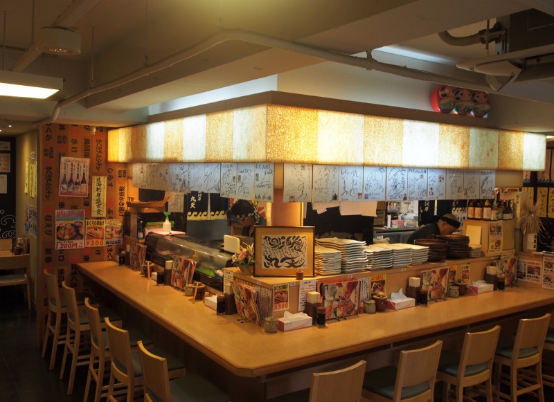 本日、目指したのはこのお店!魚河岸丸天みなと店。右側にたくさんのメニューが貼ってあるのが見えますか?とにかく様々なお魚料理が楽しめます。