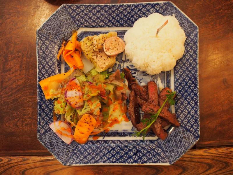 Cafe内を楽しませてもらっている間に、オーダーしたランチがやってきました。本日はOTONASAMA LUNCH(1,300円)。メインディッシュは、牛肉のお尻の部分で特に柔らかいところだけ切り出した「イチボ」。サッパリしていてとても食べやすい。