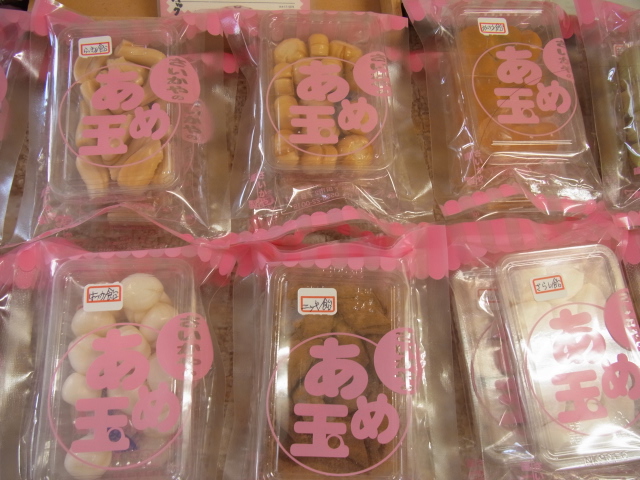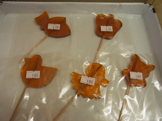 べっ甲飴や玉飴など各種販売しております。私のお勧めはにっきの飴です。他にもはとの型の飴とかもあってお土産には喜ばれそうですよ!
